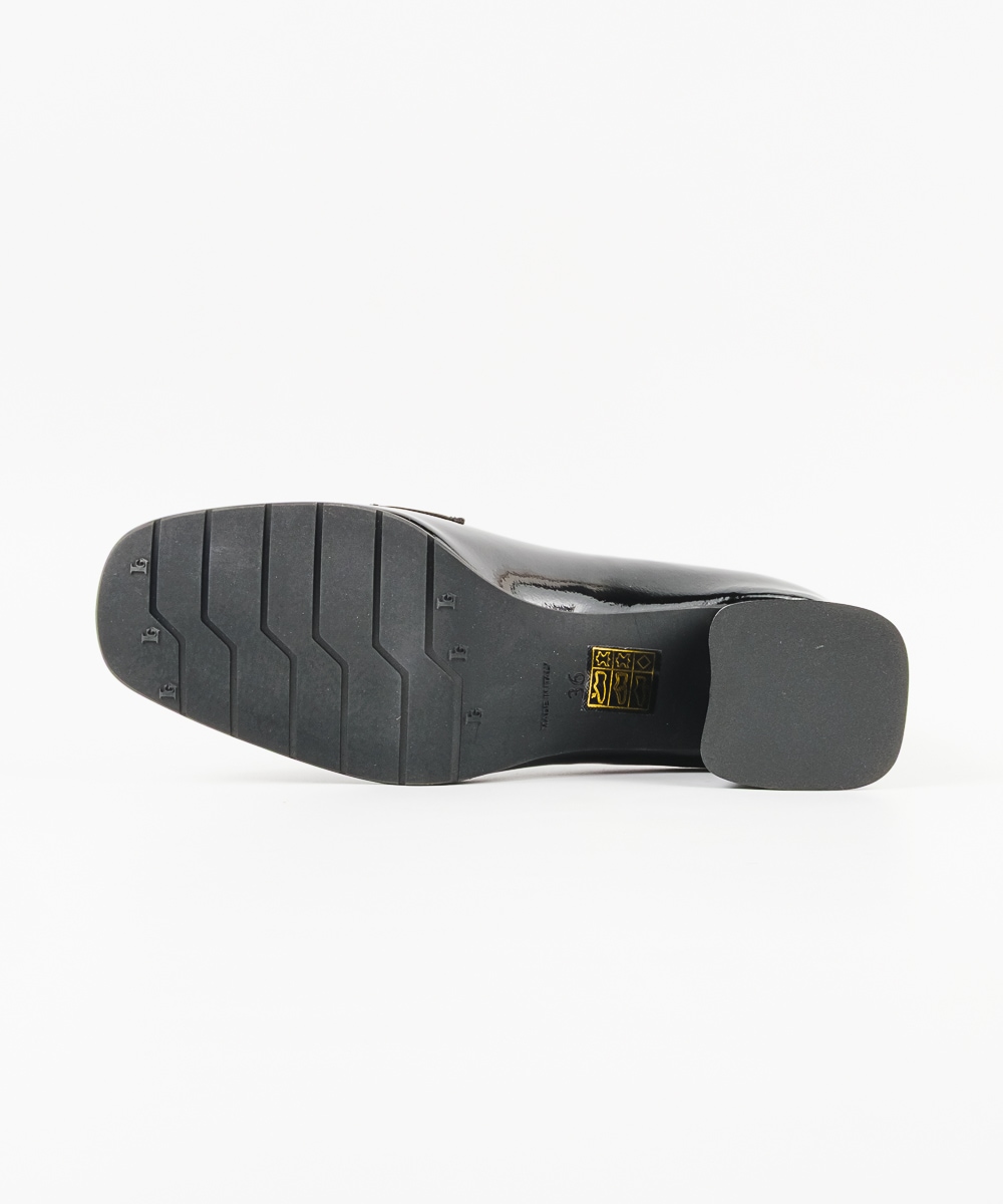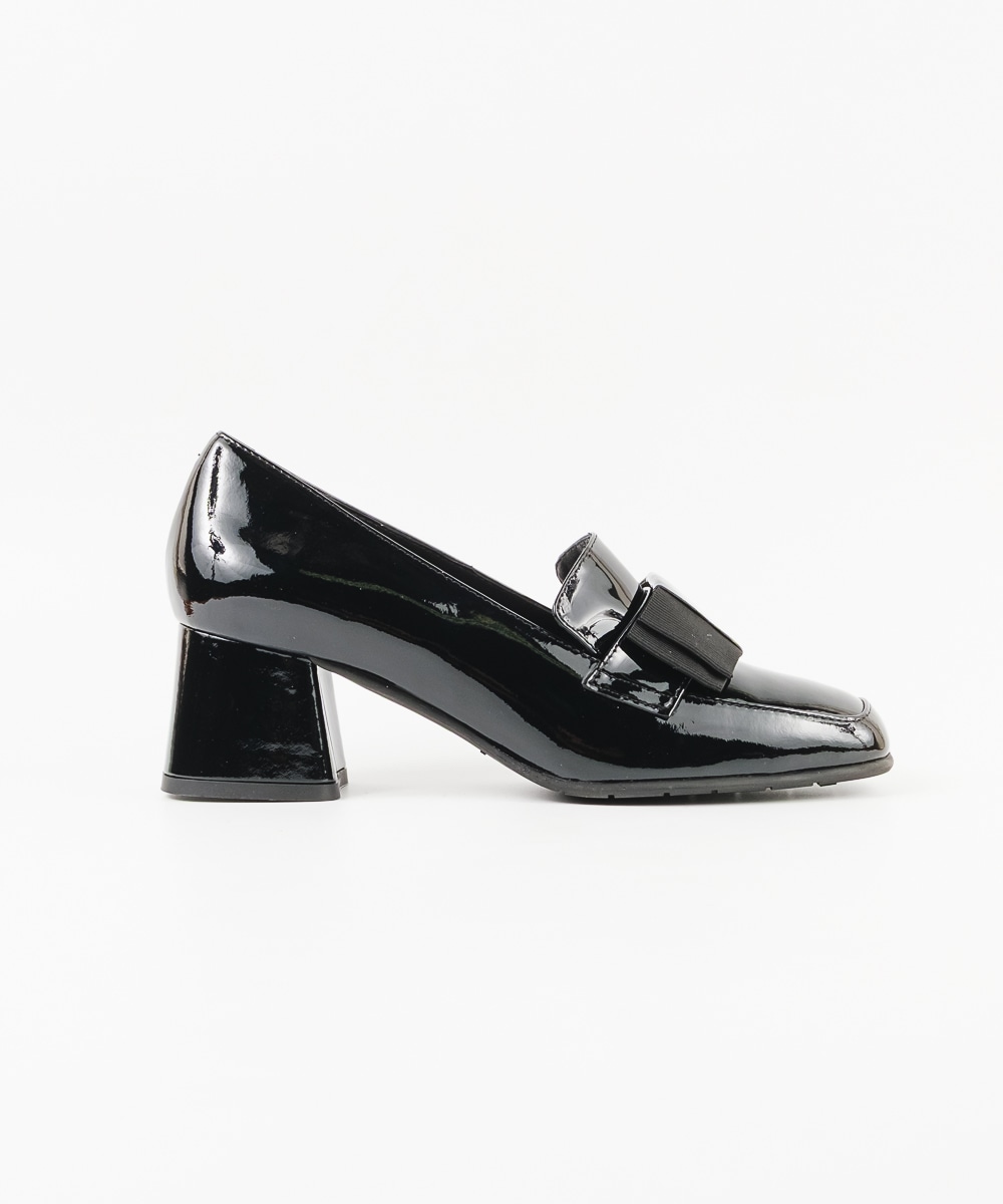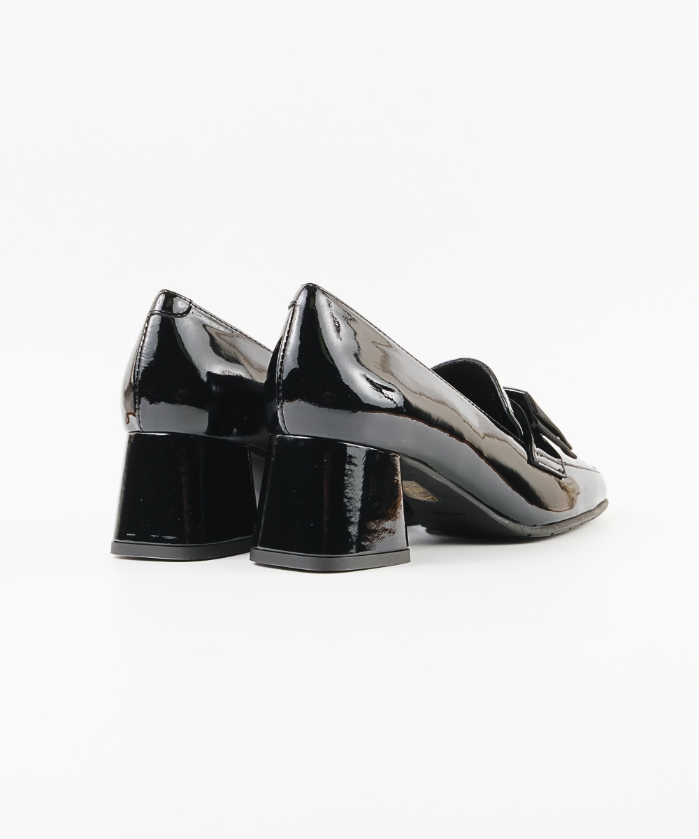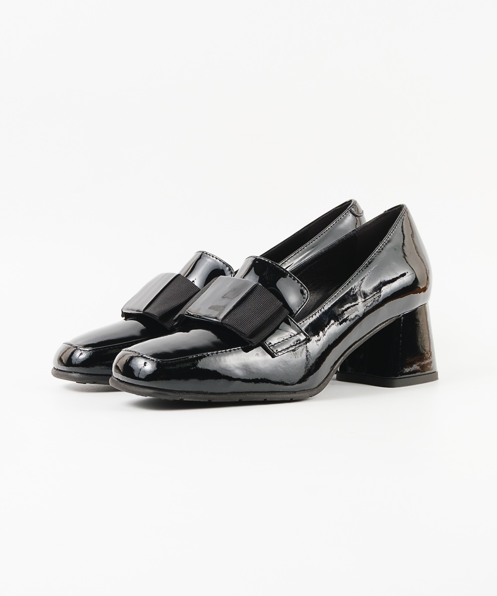 オペラシューズタイプで、甲部分にリボンがついたパンプスは、光沢のあるエナメルレザーを使用し、よりエレガンスな印象へとクラスアップ。